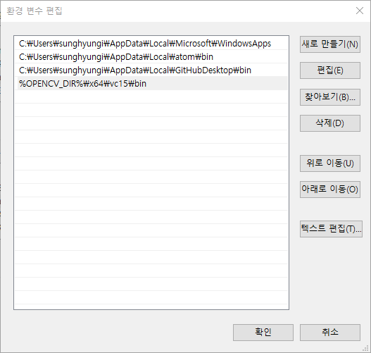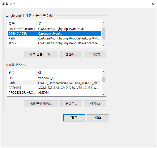 여기까지 되었다면 OpenCV 설치와 환경 변수 등록이 모두 완료되었다.
