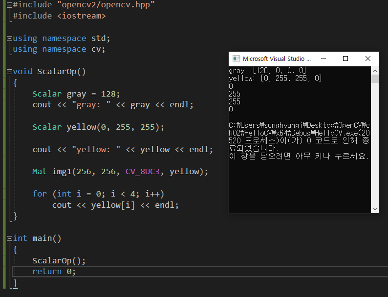 Scalar 클래스는 4 채널 이하의 영상에서 픽셀 값을 표현하는 용도로 자주 사용된다.