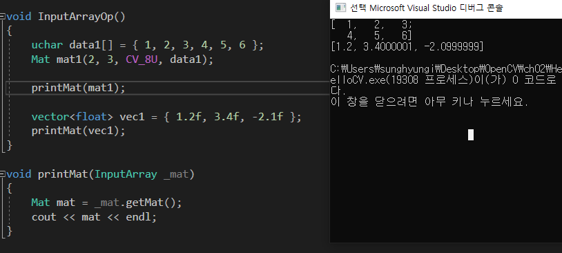 반환 시 return 구문으로 반환하는 것이 아니라 보통 OutputArray 클래스의 참조를 함수 인자로 사용하여