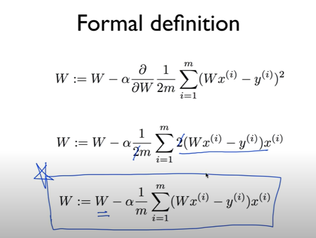 여기서, Cost가 줄어드는 방향으로 움직이는 방법은 해당 시점에서의 기울기를 이용한다. 기존의 W 값에서 기울기를 빼줌으로써 만약 그래프의 오른쪽 부분에서 시작하였다면 기울기가 양수가 되고 이것을 W 값에서 빼주면 W 값이 줄어들어 그래프상에서 왼쪽으로 이동하는 형태가 될 것이고 만약 그래프의 왼쪽 부분에서 시작하였다면 기울기가 음수가 되고 W 값이 늘어나며 그래프상에서는 오른쪽으로 이동하는 형태가 되어 기울기가 0인 부분에 도달하면 W 값에 변화가 없어질 것이고 그 부분을 minimum이라고 결정 지을 것이다.