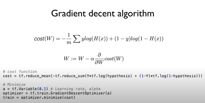 cost = -tf.reduce_mean(labels * tf.math.log(hypothesis) + (1 - labels) * tf.math.log(1 - hypothesis))