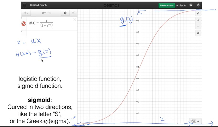 Linear 한 관점에서 우리는 H(x)=Wx+b의 가설을 세우고 W=0.5 b=0으로 가정하면 H(x)=0.5x가 될 것인데, 만약 x=100이라는 데이터가 들어간다면 H(x)는 50이 될 것이며 0, 1과는 거리가 먼 결과 값이 될 것이다. 그렇다면 이런 결과 값을 0과 1 사이의 값으로 변환시켜줄 필요가 있지 않을까? ( 결과적으로 Linear 한 가설은 Classification의 관점에 맞지 않다. )