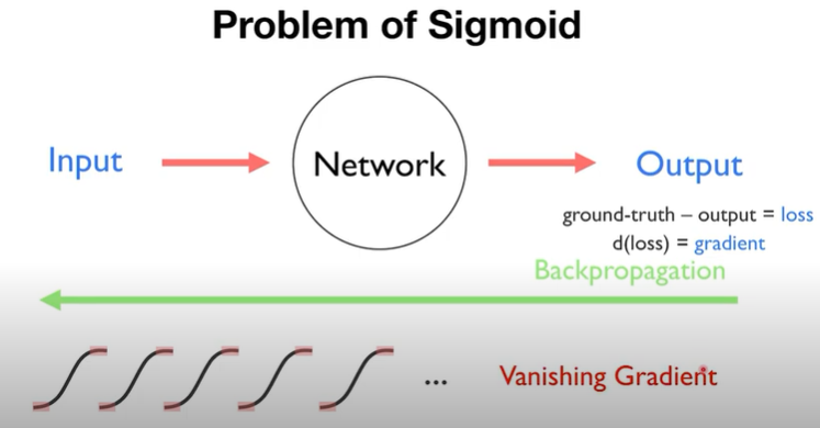그렇다면 loss의 미분은 기울기라고 할 수 있는데 sigmoid 함수의 특징상 양쪽으로 갈수록 기울기가 0에 가까워지며 그런 값들이 계속해서 곱해지면 결국 gradient가 소실되는 상황이 발생하고 Backpropagation 단계에서 이전 층이 전달받을 gradient가 없게 되는 현상이 생기는데 그것을 Vanishing Gradient라고 하고 이 현상이 sigmoid 함수의 문제점이라 할 수 있다. ( 양 극단의 미분값이 0이 되는 문제 )