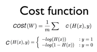y = 1 일 때는 1-y = 0 이 되어서 c = -log(1+(x))가 되며 y = 0 일 때는 -log(1-H(x))가 되어서 앞서서 봤던 케이스가 나뉜 Cost function과 같아질 것이다.