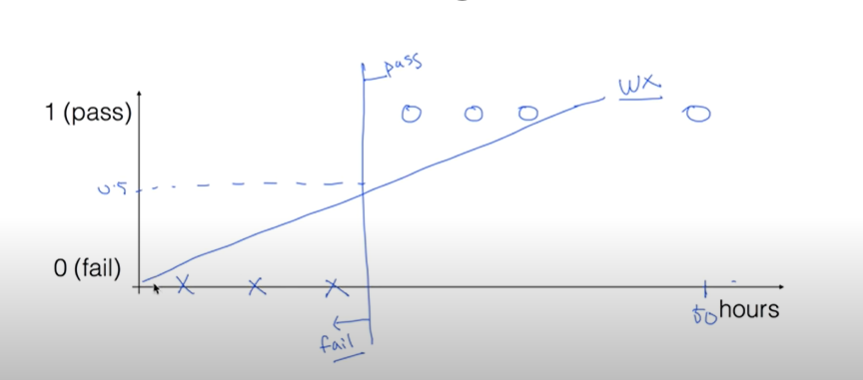 위의 그래프를 보면 기존에 Pass 취급을 받았던 데이터 2개가 새로 직선을 만들어줌으로써 Fail이 될 수 있는 문제가 발생할 수 있고 이는 Classification의 관점에서 Linear 한 가설은 맞지 않음을 확인할 수 있다.