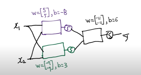 위의 그림은 XOR 문제를 해결하는 하나의 예시이다. 위와 같이 하나의 시스템이 아닌 여러개의 시스템을 이용하여 우리가 원하는 XOR 문제의 결과를 도출해낼 수 있다.