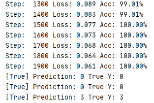 print("Step: {:5}\tLoss: {:.3f}\tAcc: {:.2%}".format(step, loss, acc))