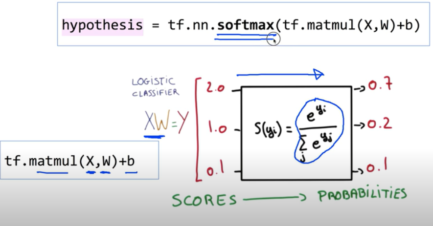 hypothesis 변수를 만들때 matmul을 이용하여 XW를 구현하고 TensorFlow에서 제공하는 sigmoid 함수를 이용하여 이전에 우리가 세웠던 가설에 맞게 구현해준다.