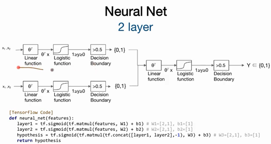 그렇다면 3개의 Logistic Regression을 통해(Neural Net) 어떤 식으로 XOR 문제를 해결하였는지 확인해보자.