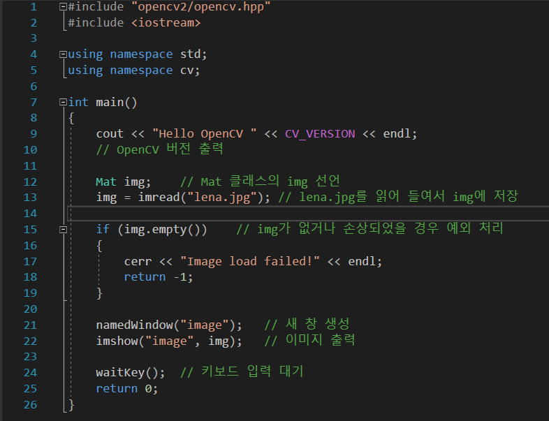 24행 : waitKey함수를 이용하여 키보드에 입력 신호가 들어올 때까지 대기(이미지 창을 대기)